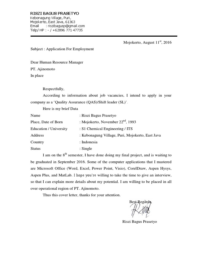 X research source when you explain how you can contribute to the company, remember that you want to put yourself in the shoes of the hiring manager. However, if the job listing doesn't specify a cover letter, you may want to include the same sort of information in your email that you would in a formal cover letter. Untuk mengunduh surat lamaran kerja dan cover letter dalam format doc/docx, anda bisa melihatnya di bagian bawah artikel ini. Sep 04, 2020 · if the job listing requests a résumé or cv and cover letter, write a separate cover letter and attach it to the email along with your résumé or cv. Memiliki kemampuan berbahasa inggris yang baik secara pasif dan terlebih aktif akan menambah nilai jual seseorang dalam dunia kerja.